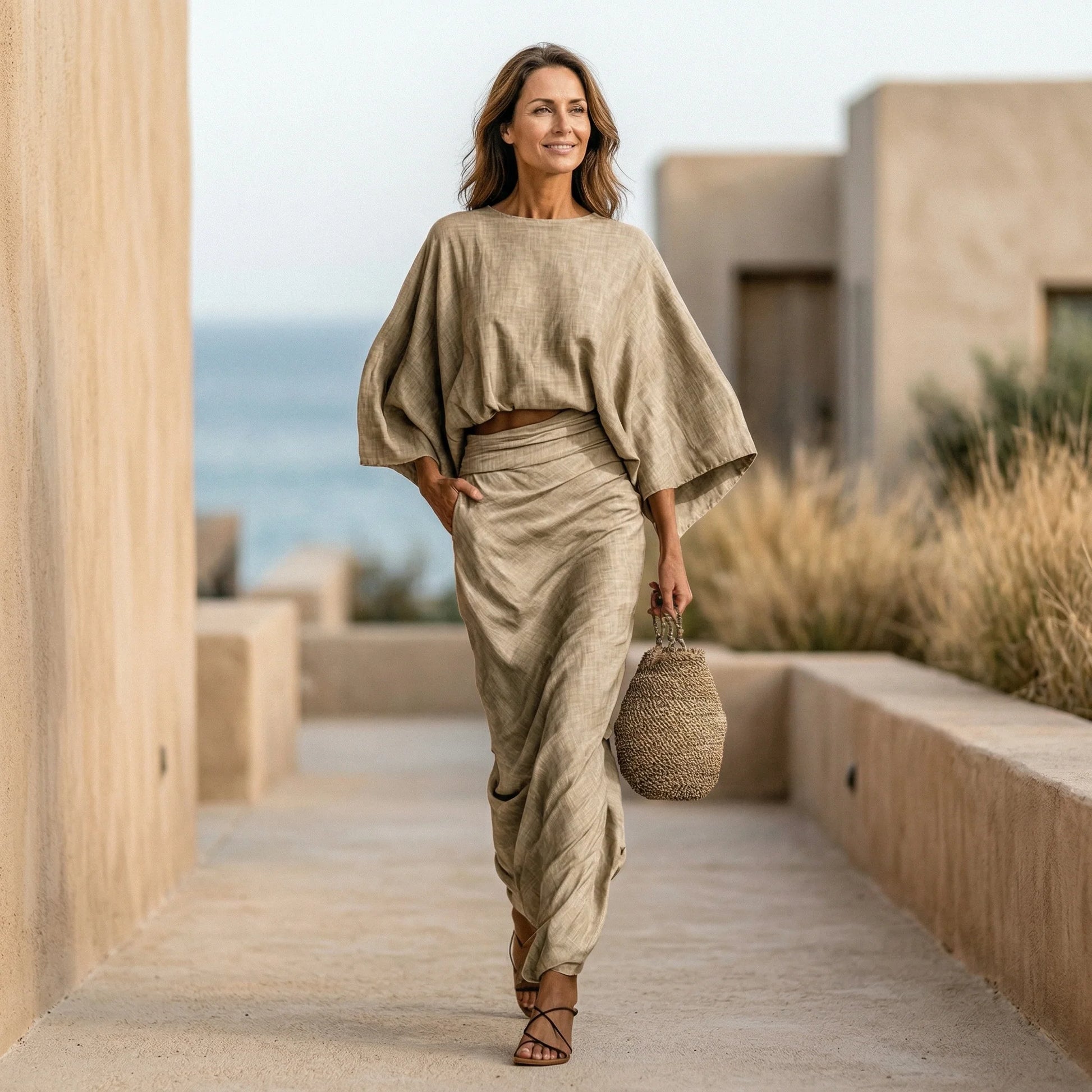 Este elegante conjunto de 2 piezas combina una blusa de corte holgado con elegantes mangas murciélago y una falda larga que se mueve bellamente con cada paso. El ajuste relajado otorga al conjunto un aspecto sofisticado que resulta cómodo y femenino a la vez.